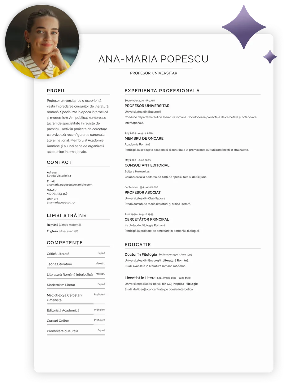 Da, poți folosi fonturi și elemente grafice creative pentru a evidenția personalitatea și creativitatea, însă este important să păstrezi un echilibru. Designul trebuie să rămână lizibil și compatibil cu sistemele ATS, evitând elementele prea elaborate care ar putea împiedica recunoașterea corectă a informațiilor.